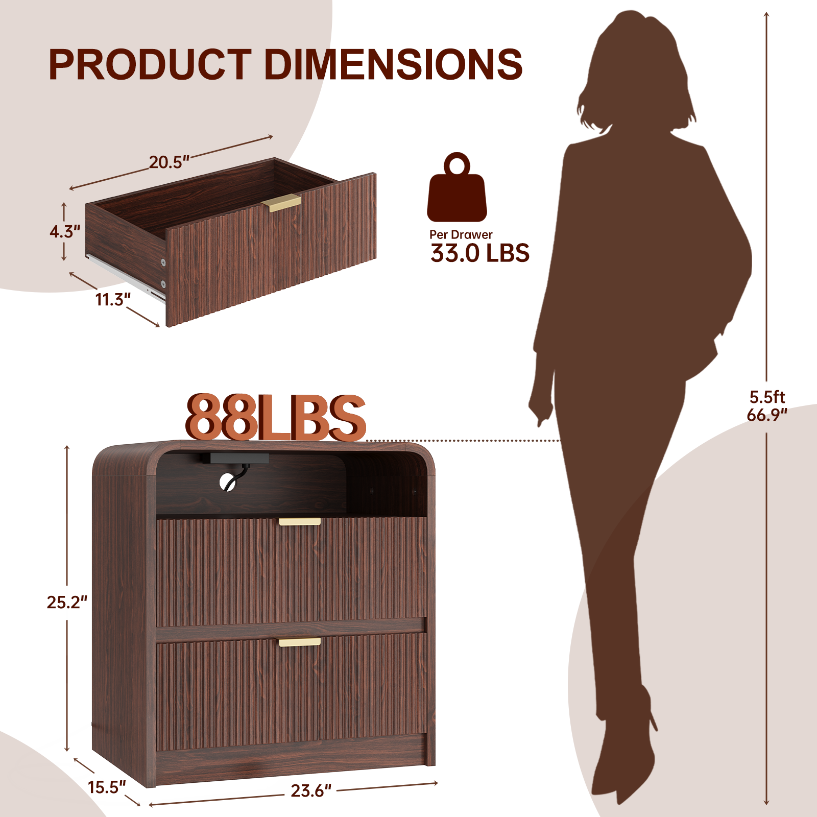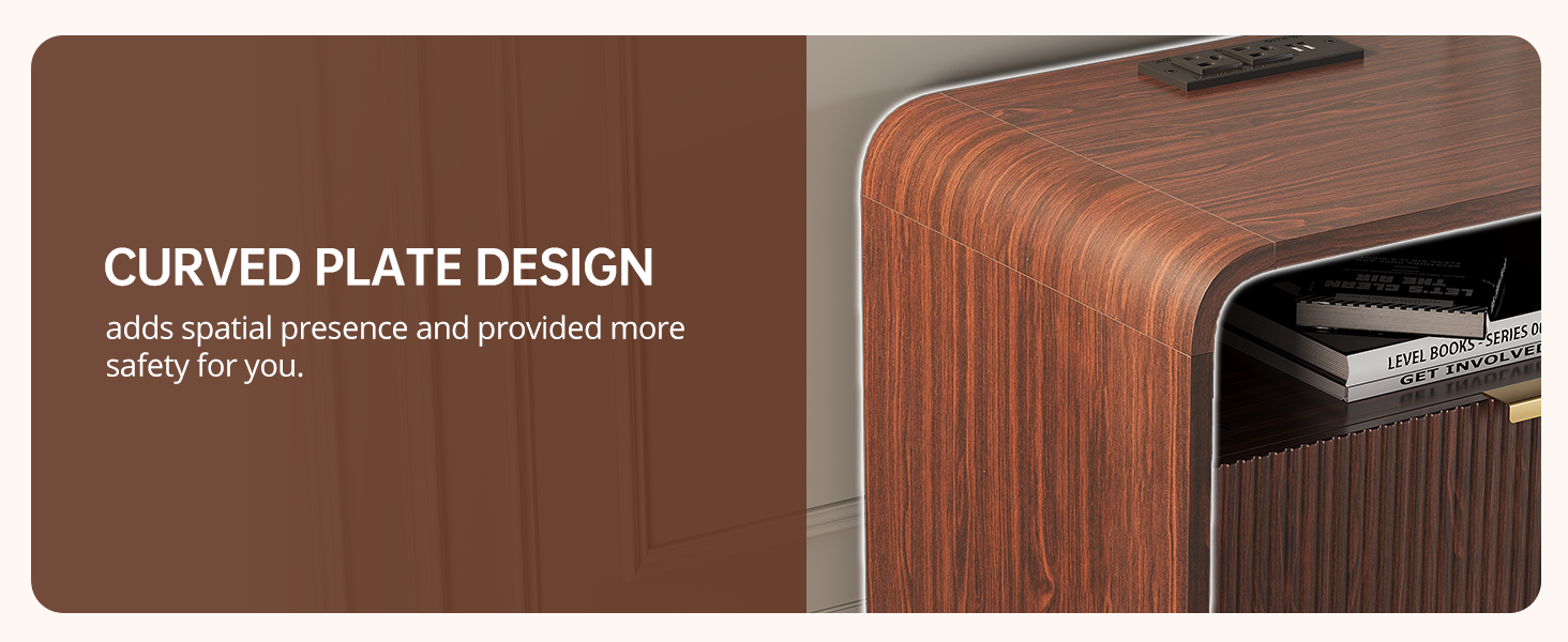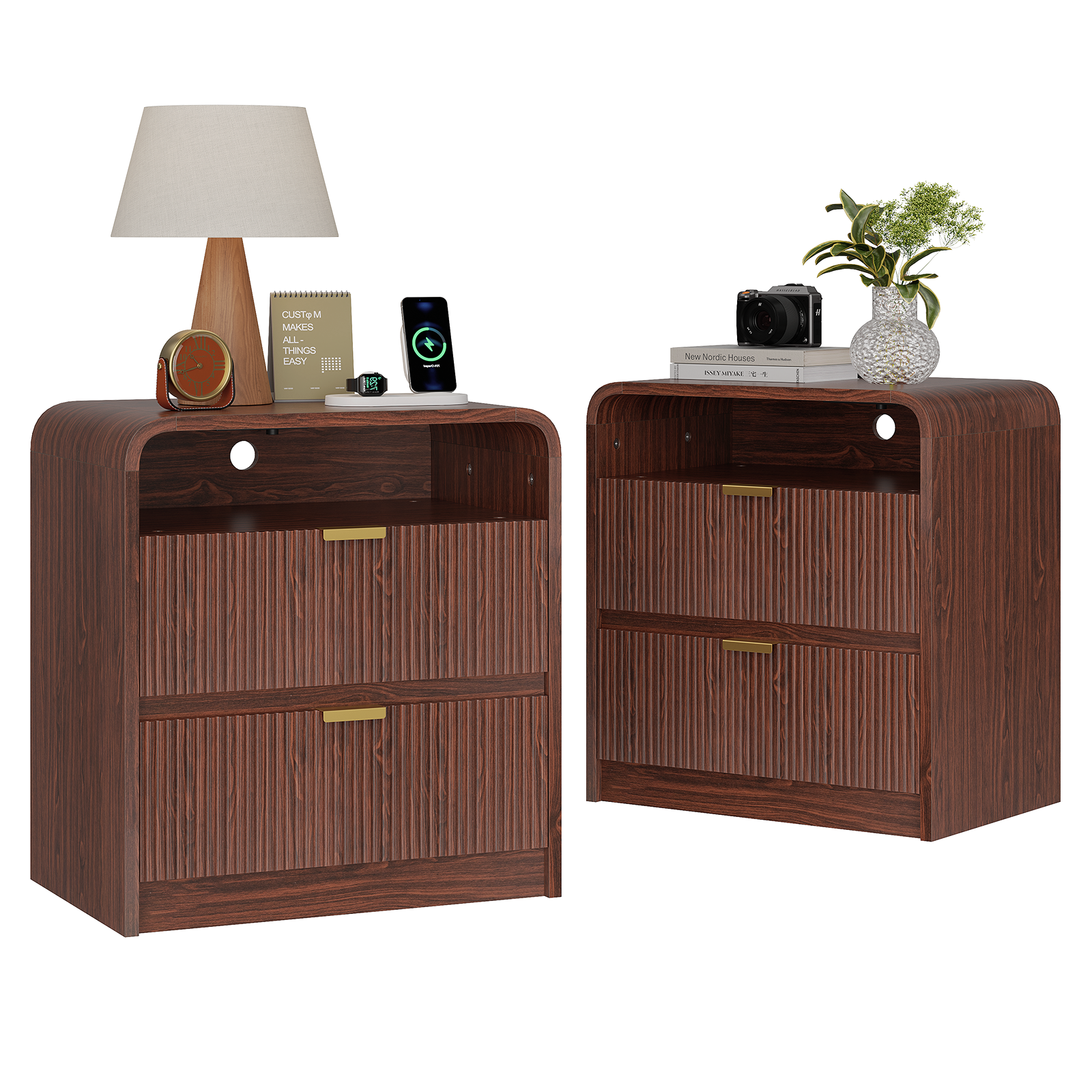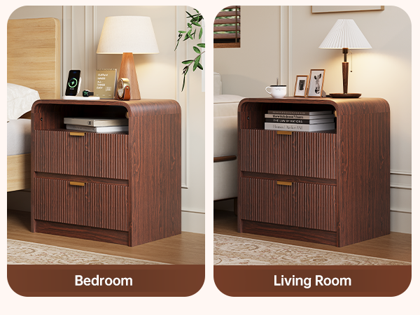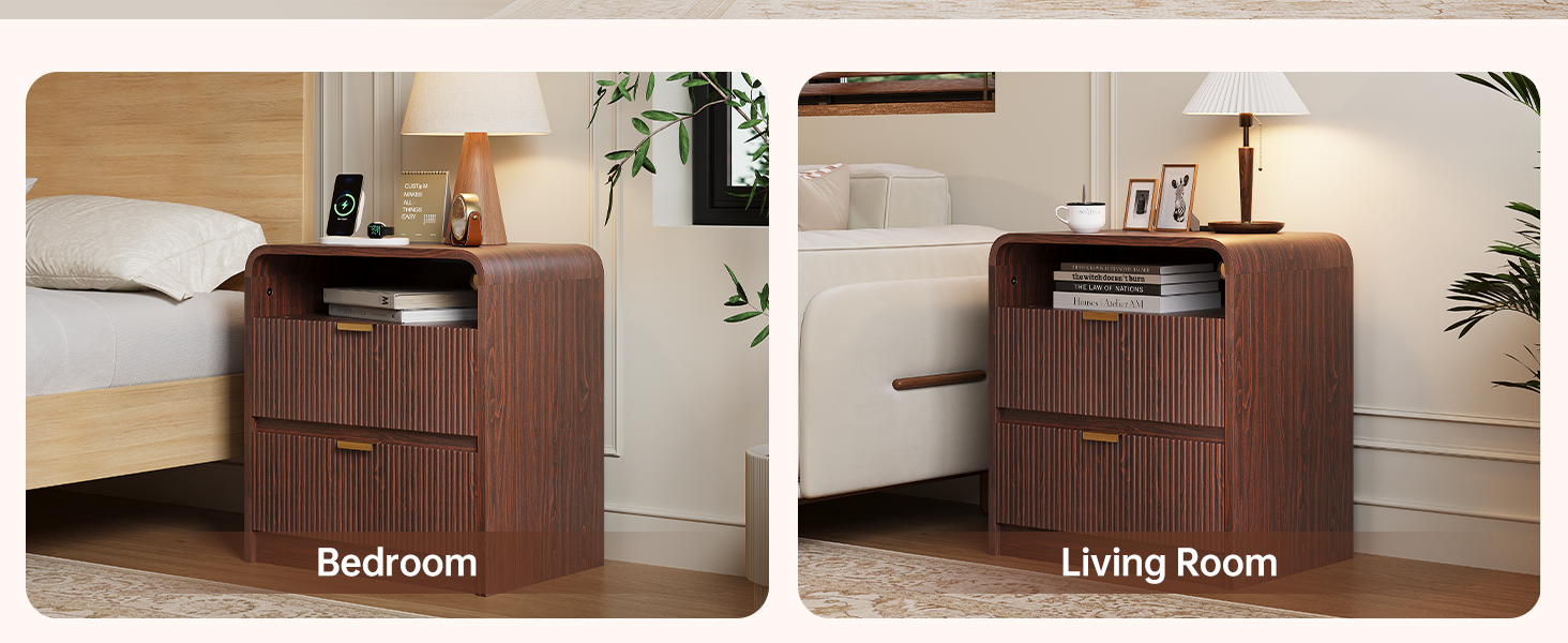 24" Fluted Nightstand with Charging Station, Wooden End Table with 2 Drawers Storage, Curved Profile Design, Modern Bedside Cabinet for Bedroom Living Room, Walnut