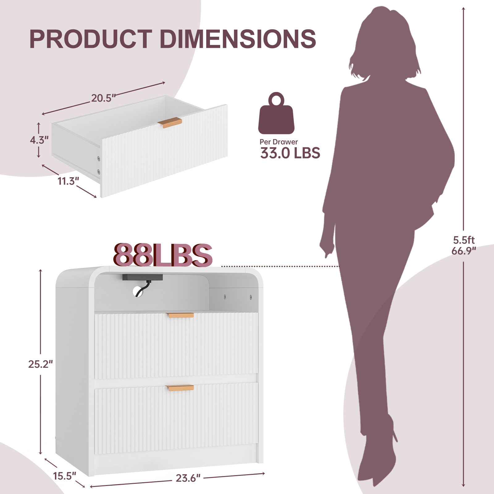 • Bedside Cabinet with 2 AC outlets & 2 USB ports conveniently located along the top, this nightstand has your charging needs covered. Measuring 24"W × 15.5"D × 25"H, brings both function and flair to your home organization. The top surface for staging framed photos, artful accents, and more.