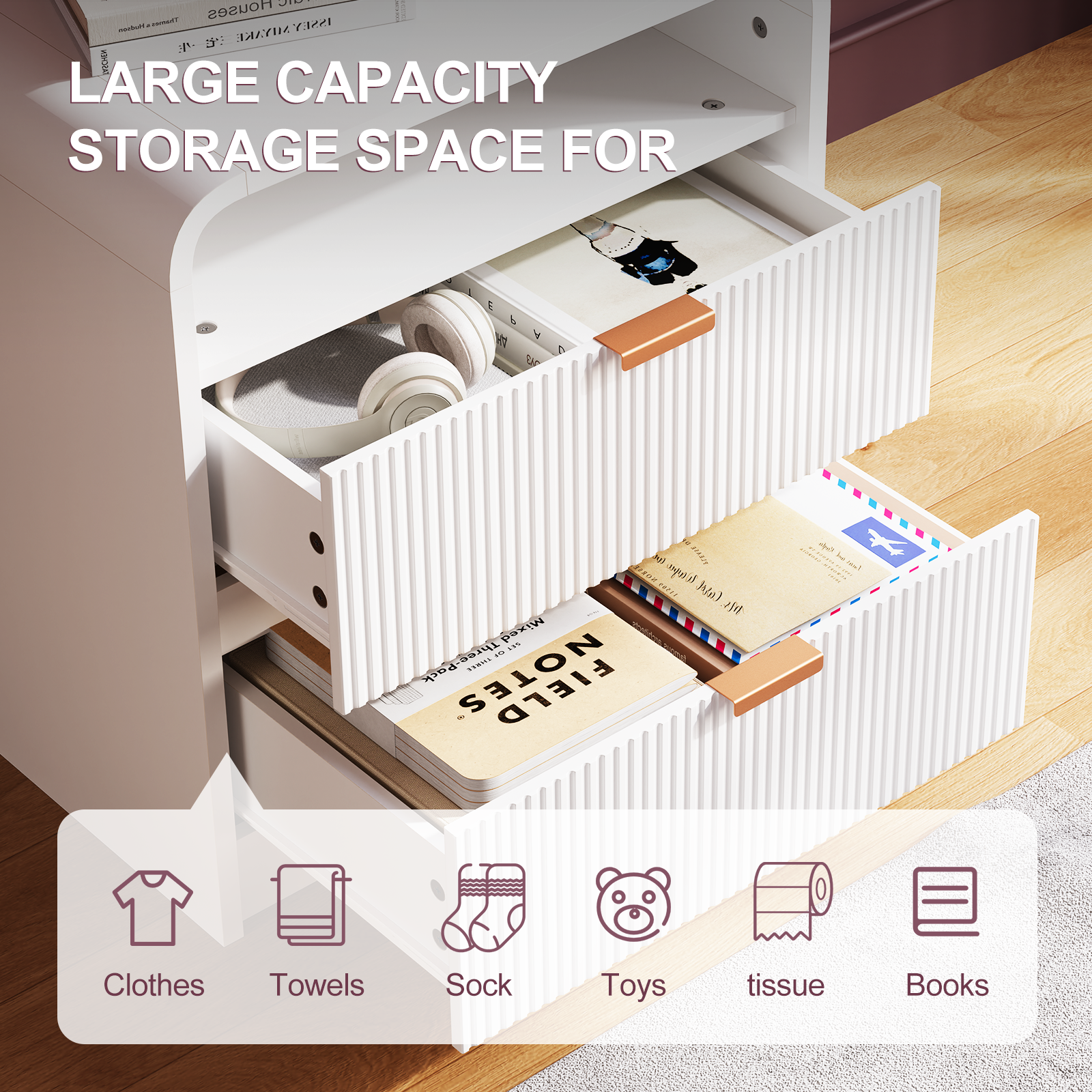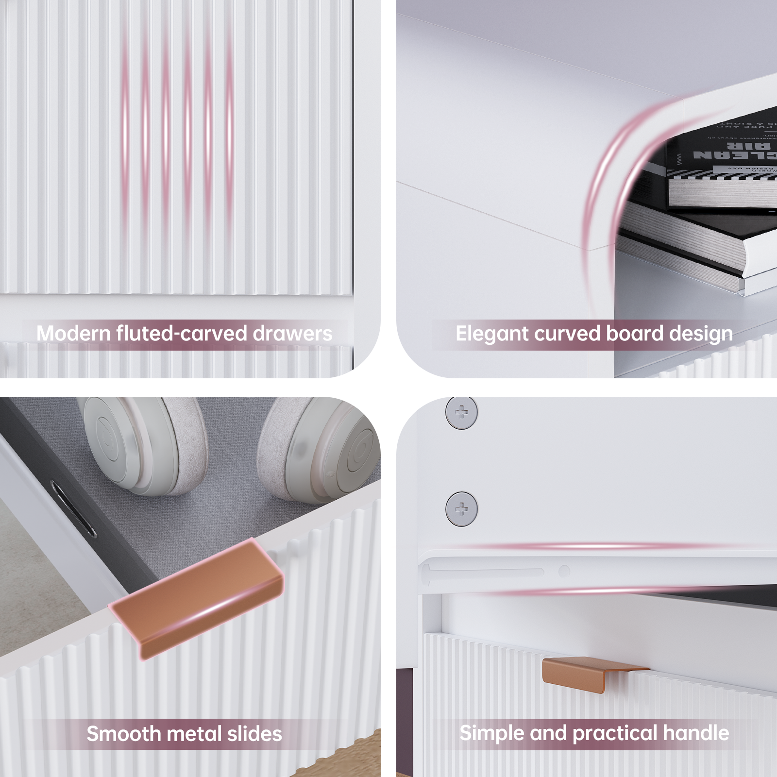 • Elevate your space with this nightstand, blending artful design and modern durability. Sculpted fluted details create captivating texture and depth, turning functional storage into a statement piece for any bedroom or living area.