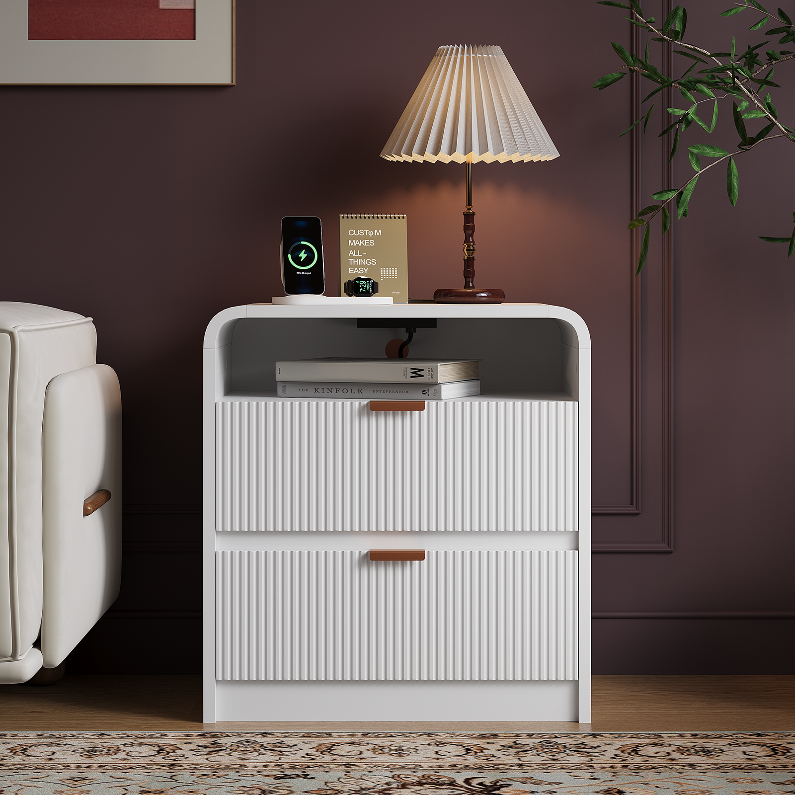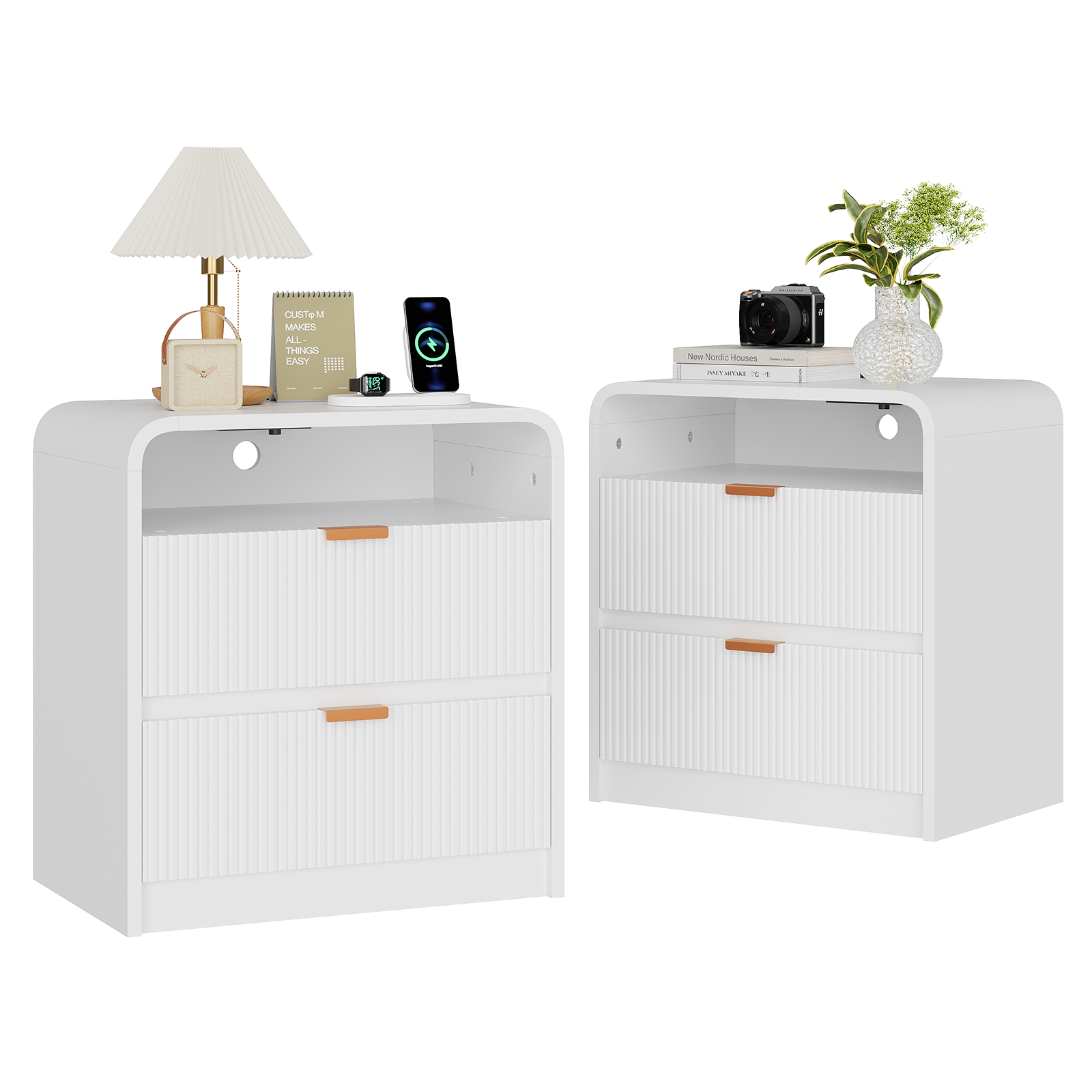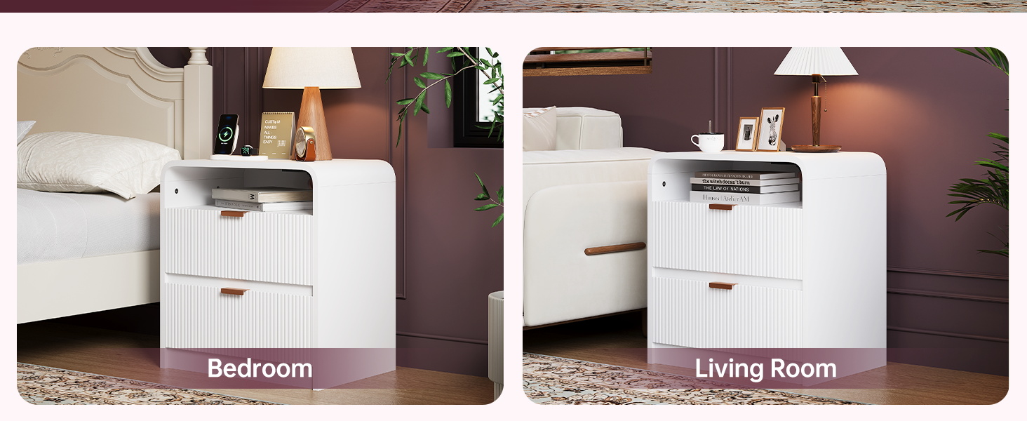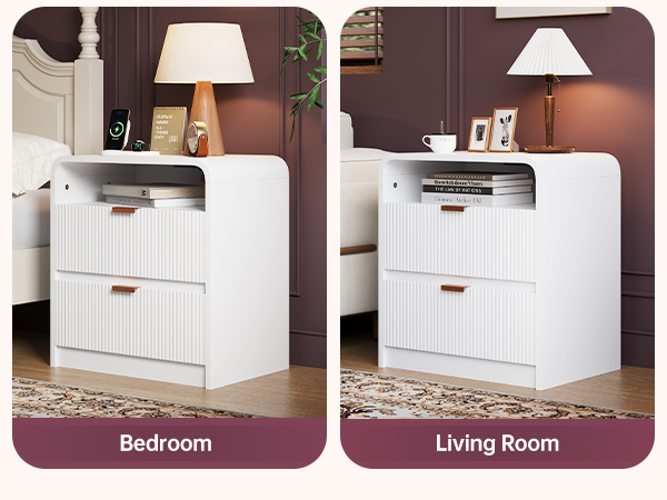 24" Fluted Nightstand with Charging Station, Wooden End Table with 2 Drawers Storage, Curved Profile Design, Modern Bedside Cabinet for Bedroom Living Room, White