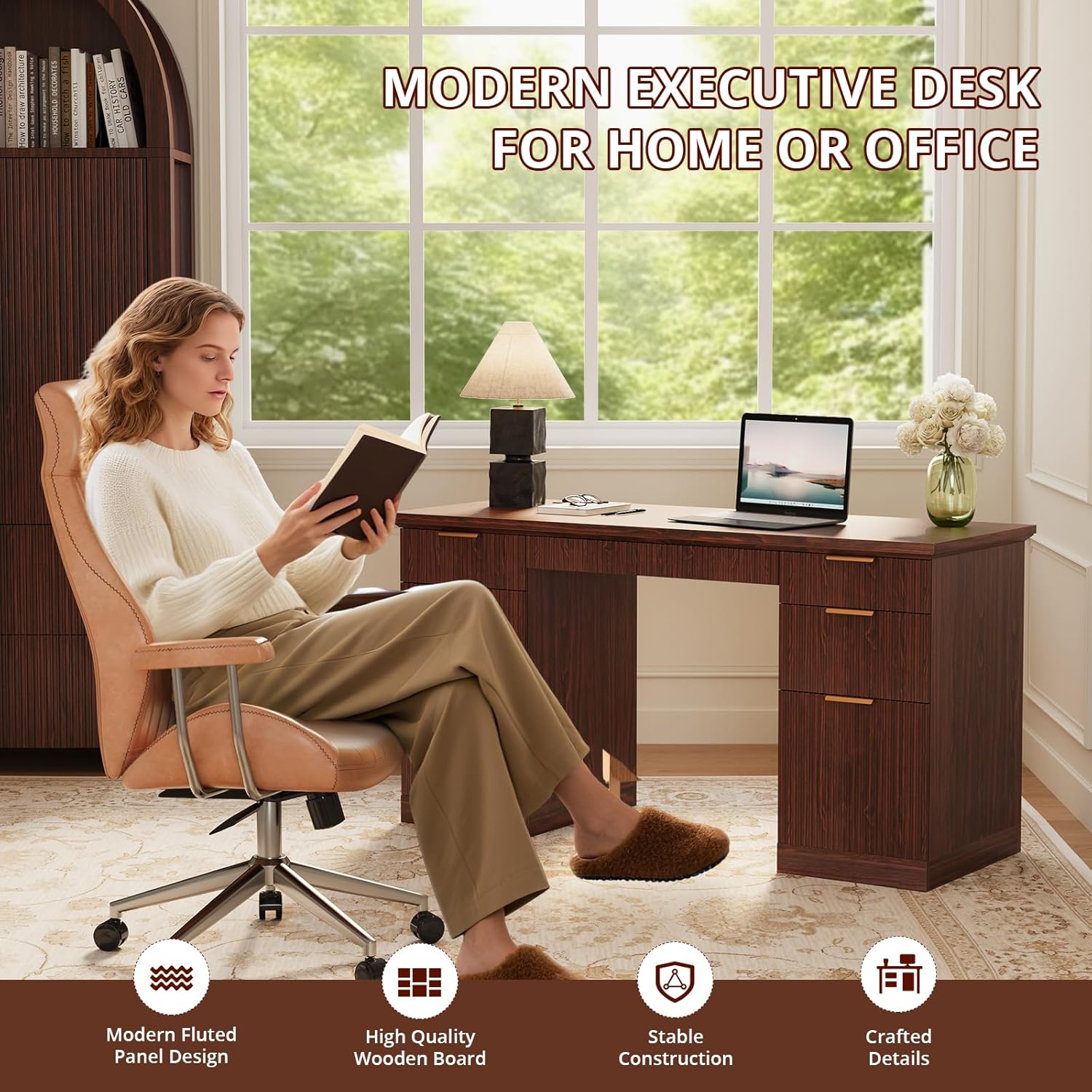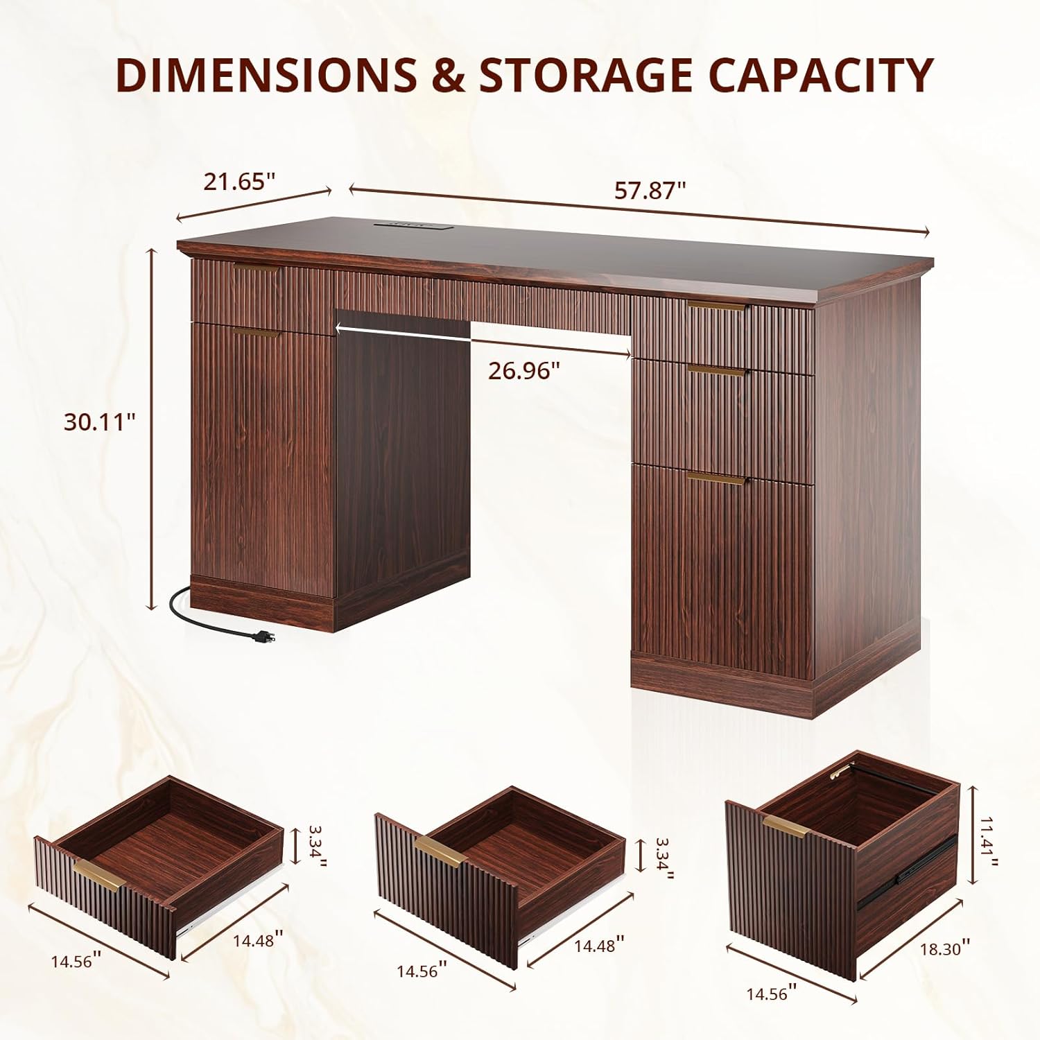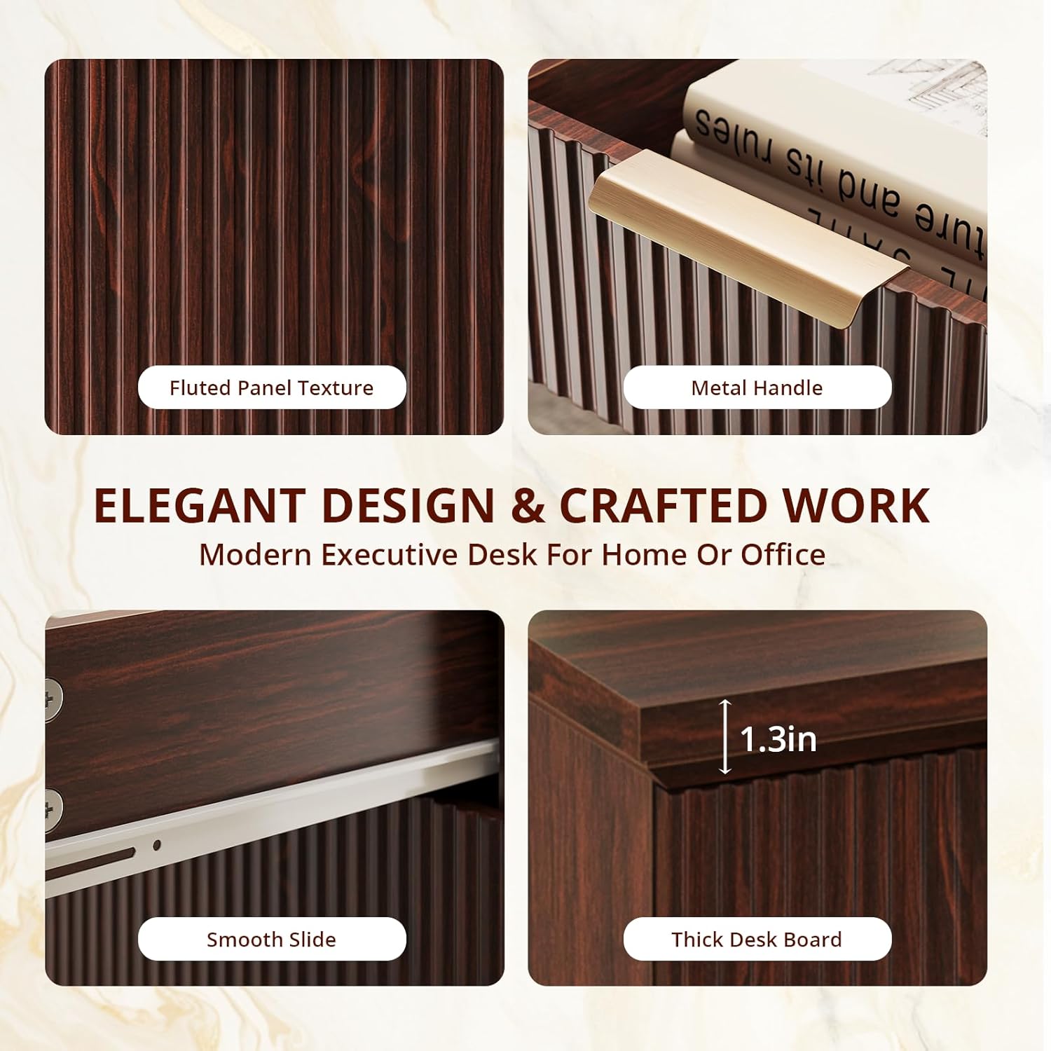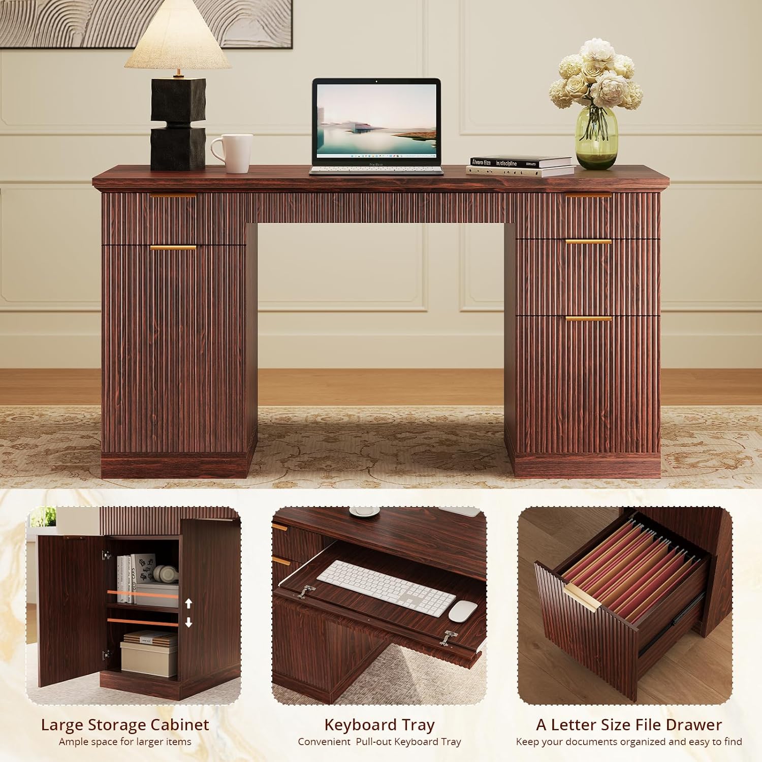 58" Fluted Modern Desk with Storage, Home Office Desk with 1 File Cabinet & 5 Drawers, Wood Executive Computer Writing Desk for Study, Living Room, Bedroom (Dark Walnut)