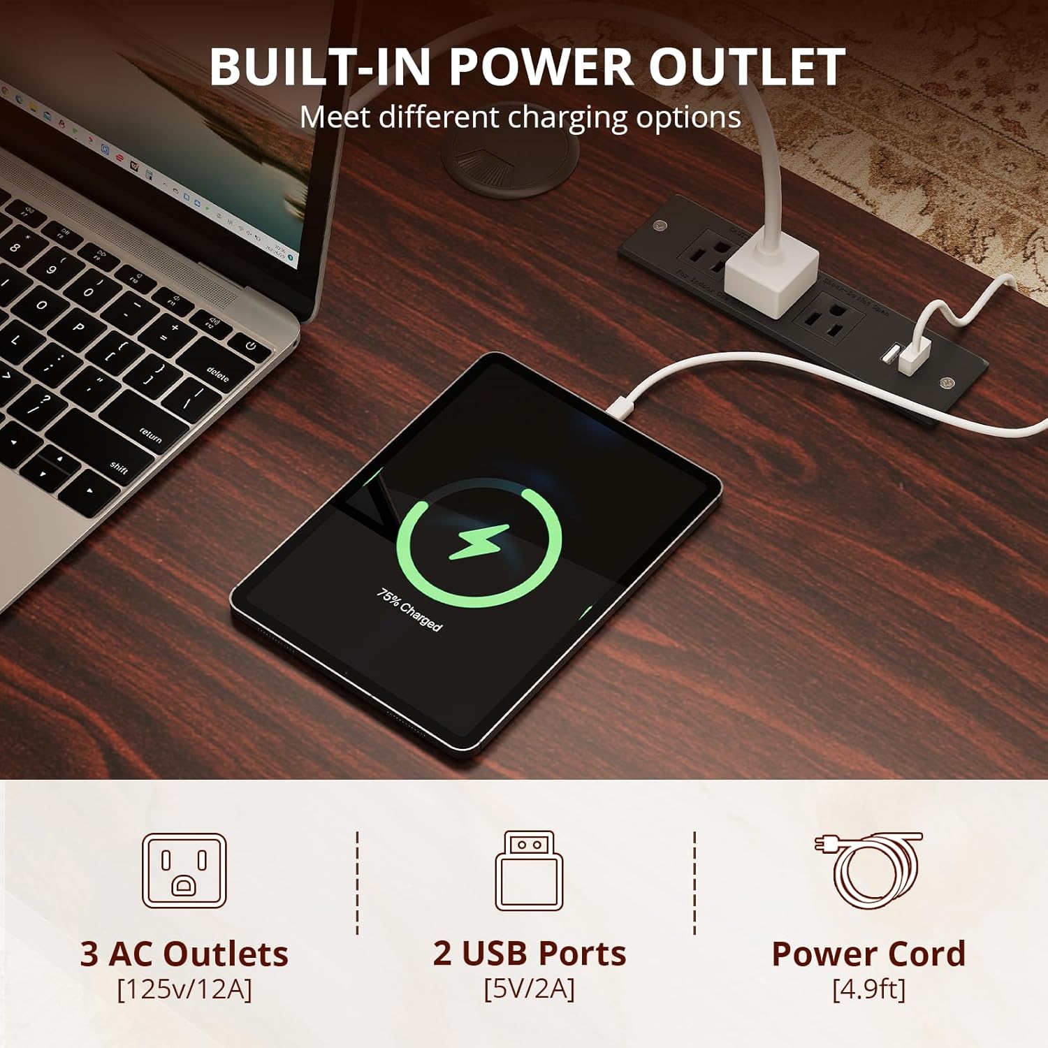 • This computer desk stays powered up with the built-in charging station, featuring 2 USB ports and 3 AC outlets—ideal for keeping your devices charged and cords neatly managed.