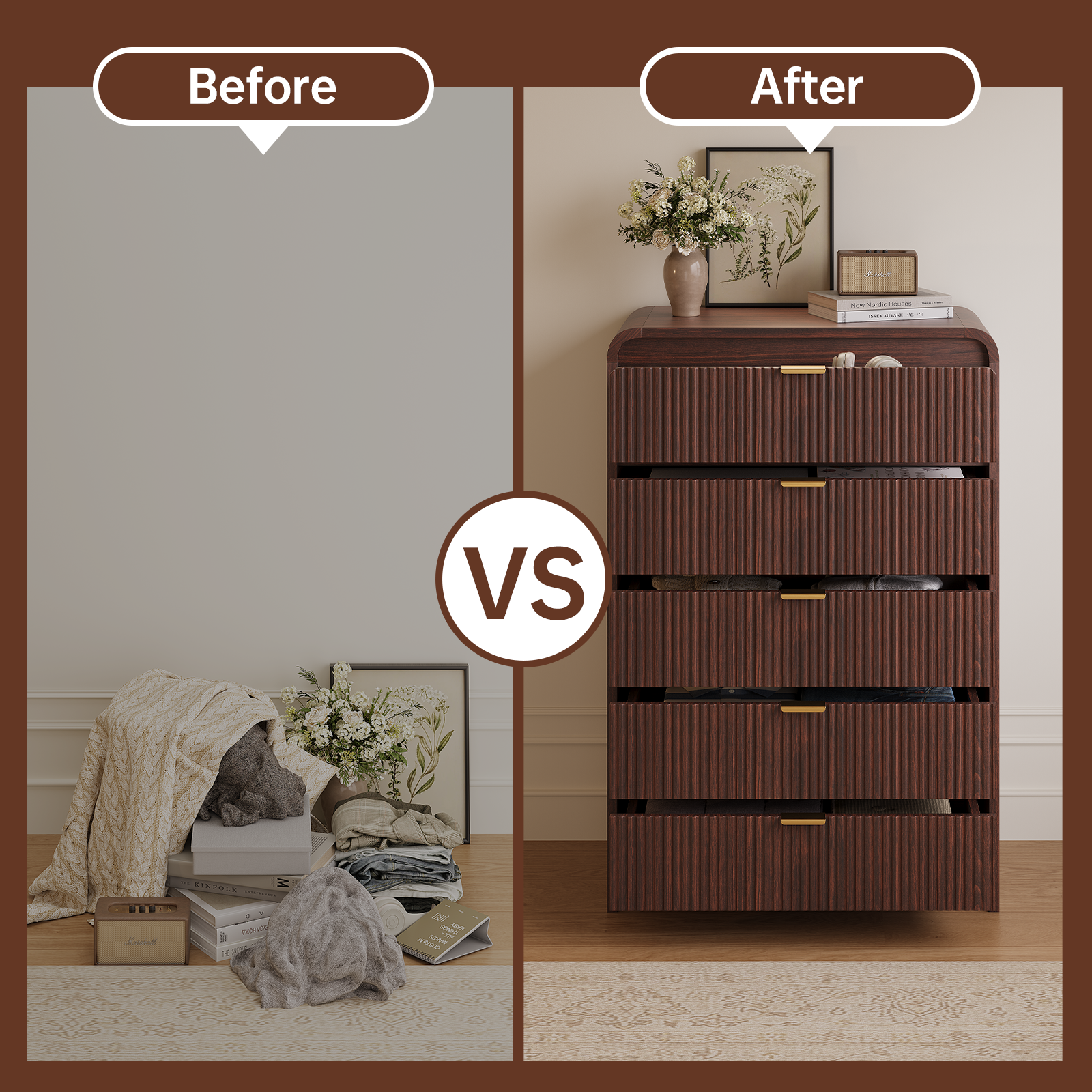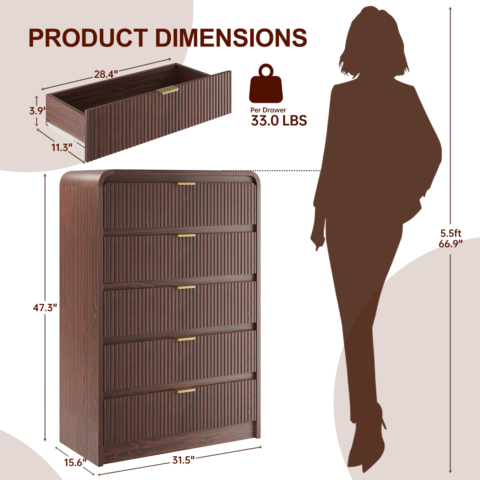 Fluted 5 Drawers Dresser for Bedroom, 48" Tall Wooden Modern Dresser with Metal Handle, Curved Profile Design, Storage Organizer for Living Room, Hallway (Walnut)