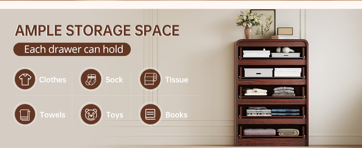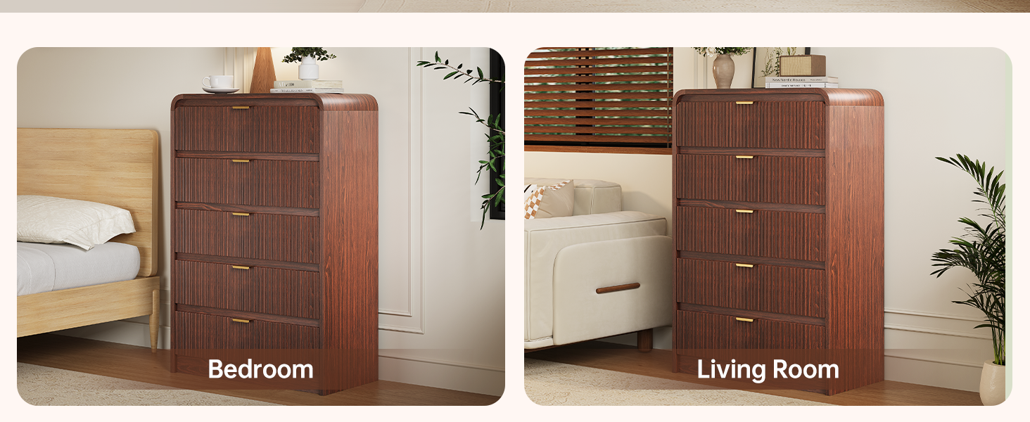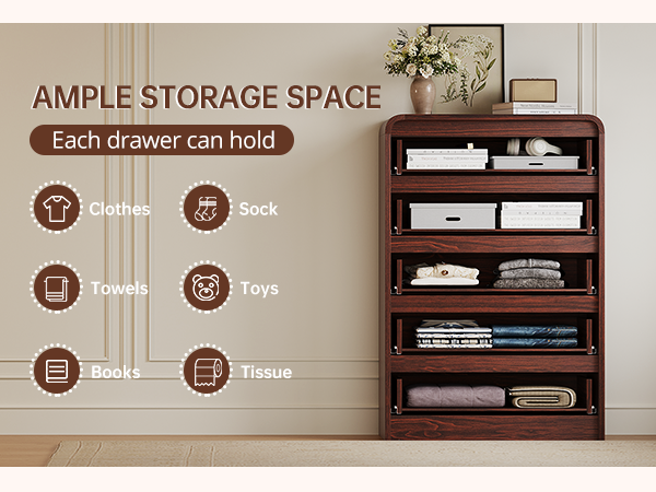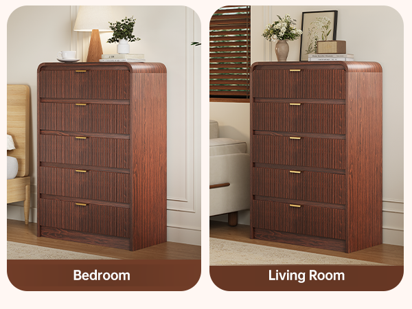 • 5 drawers dresser measuring 31.5"W × 15.5"D × 48"H, brings both function and flair to your home organization. The expansive top surface becomes your personal display area - suit for styling framed family photos and your decor finds. 5 smooth-gliding drawers keep your bedroom essentials and daily accessories. Keeping your space clutter-free while adding character to bedrooms, living areas, entryway drop zones, or hallway nooks.