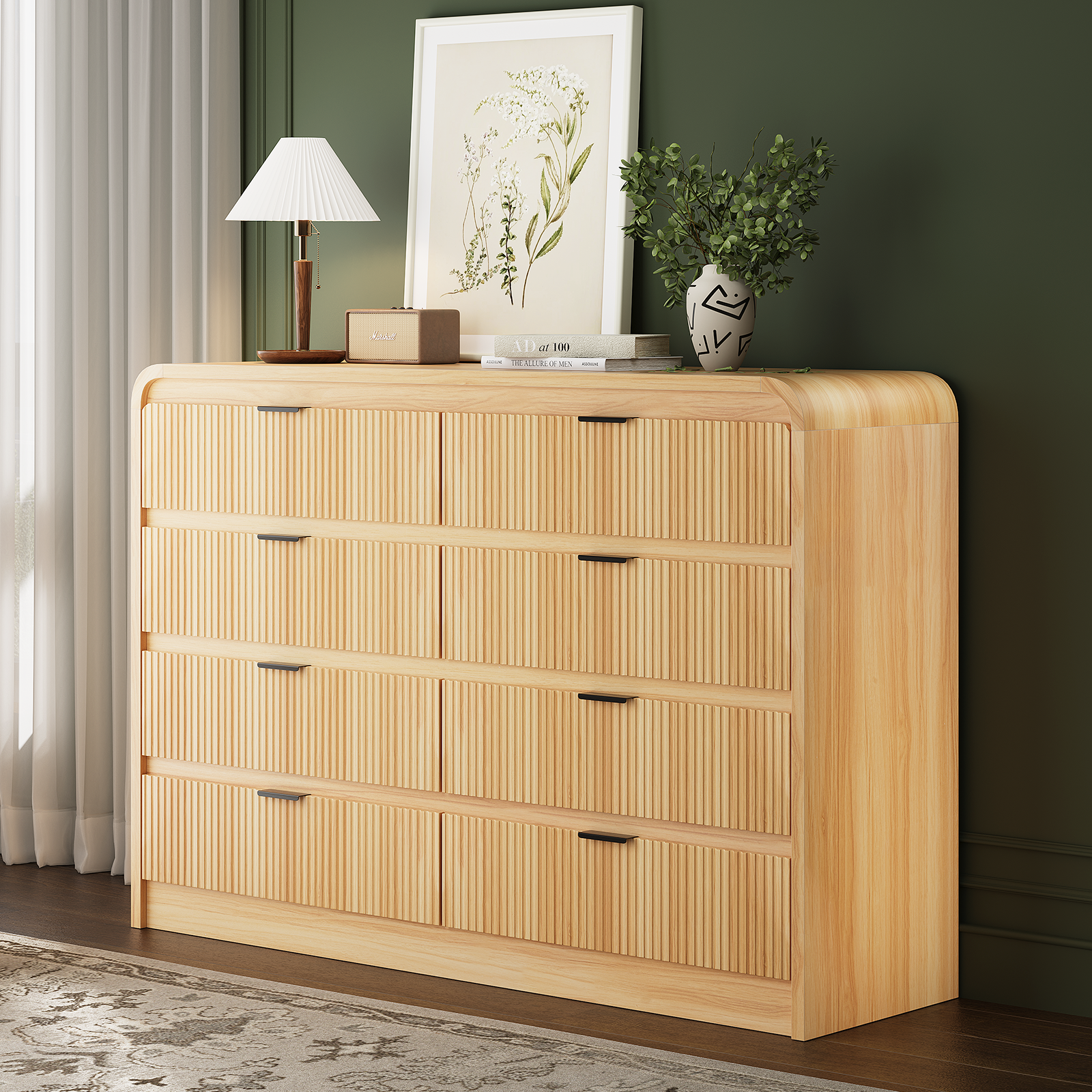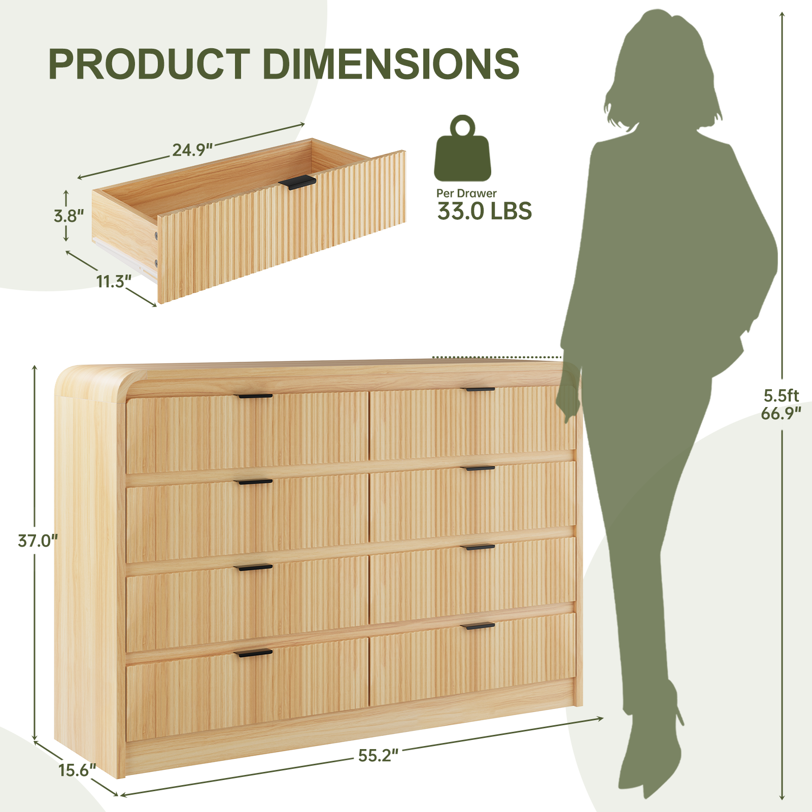 Fluted 8 Drawers Dresser for Bedroom, 55" Wide Wooden Dresser with Metal Handle, Curved Profile Design, Modern Storage Organizer for Living Room, Hallway (Natural Oak)