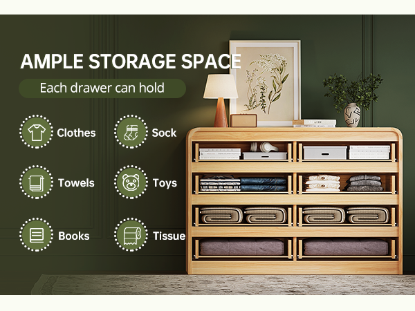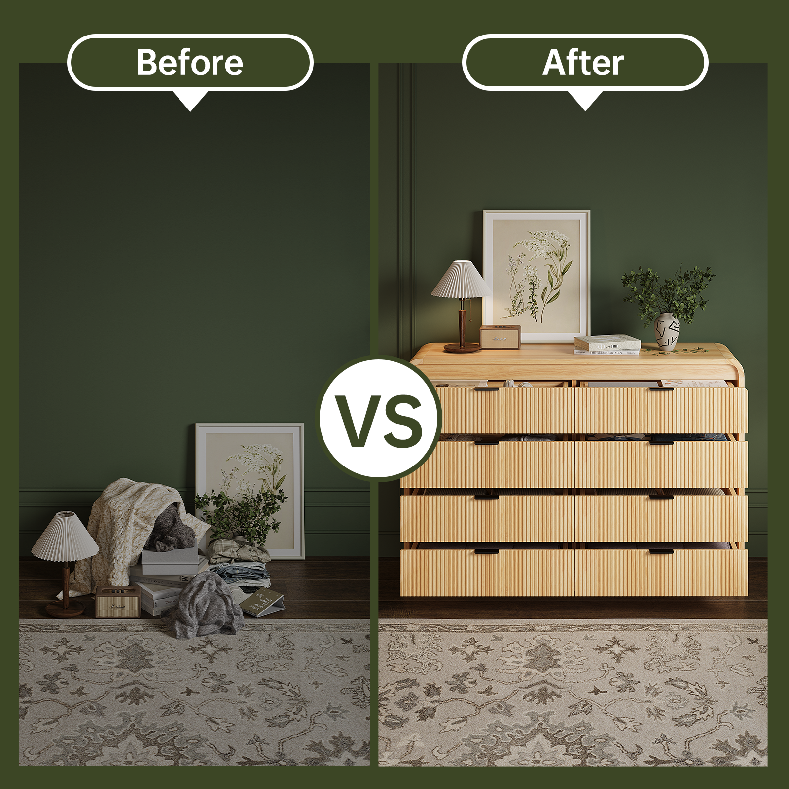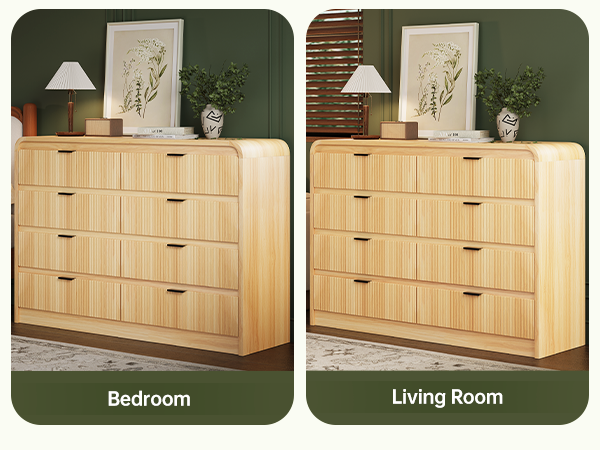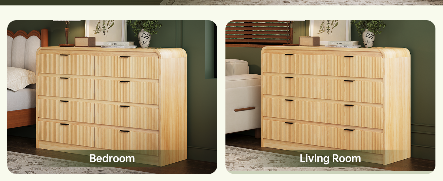 • 8 drawers dresser measuring 55"W × 15.5"D × 37"H, brings both function and flair to your home organization. The expansive top surface becomes your personal display area - suit for styling framed family photos and your decor finds. 8 smooth-gliding drawers keep your bedroom essentials and daily accessories. Keeping your space clutter-free while adding character to bedrooms, living areas, entryway drop zones, or hallway nooks.