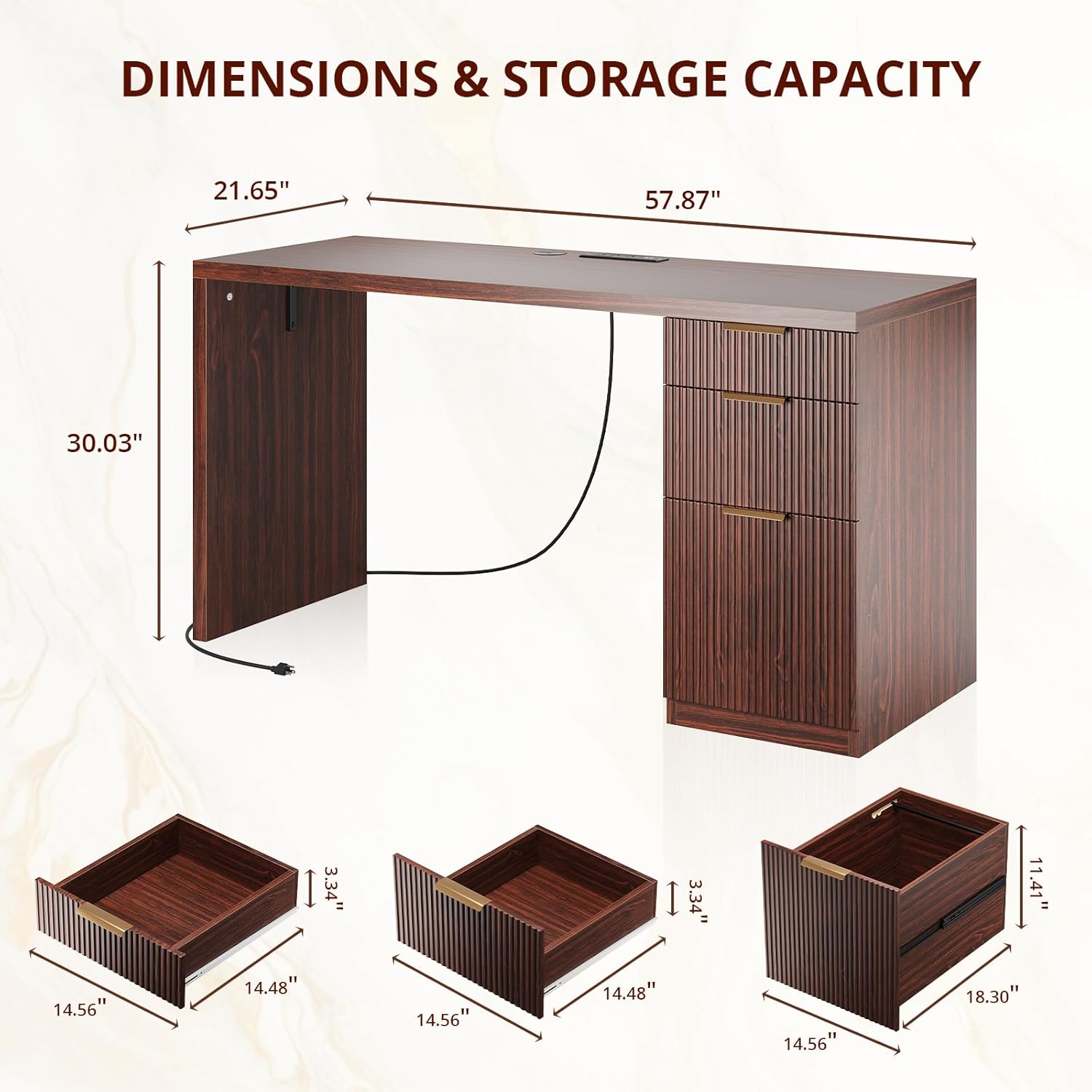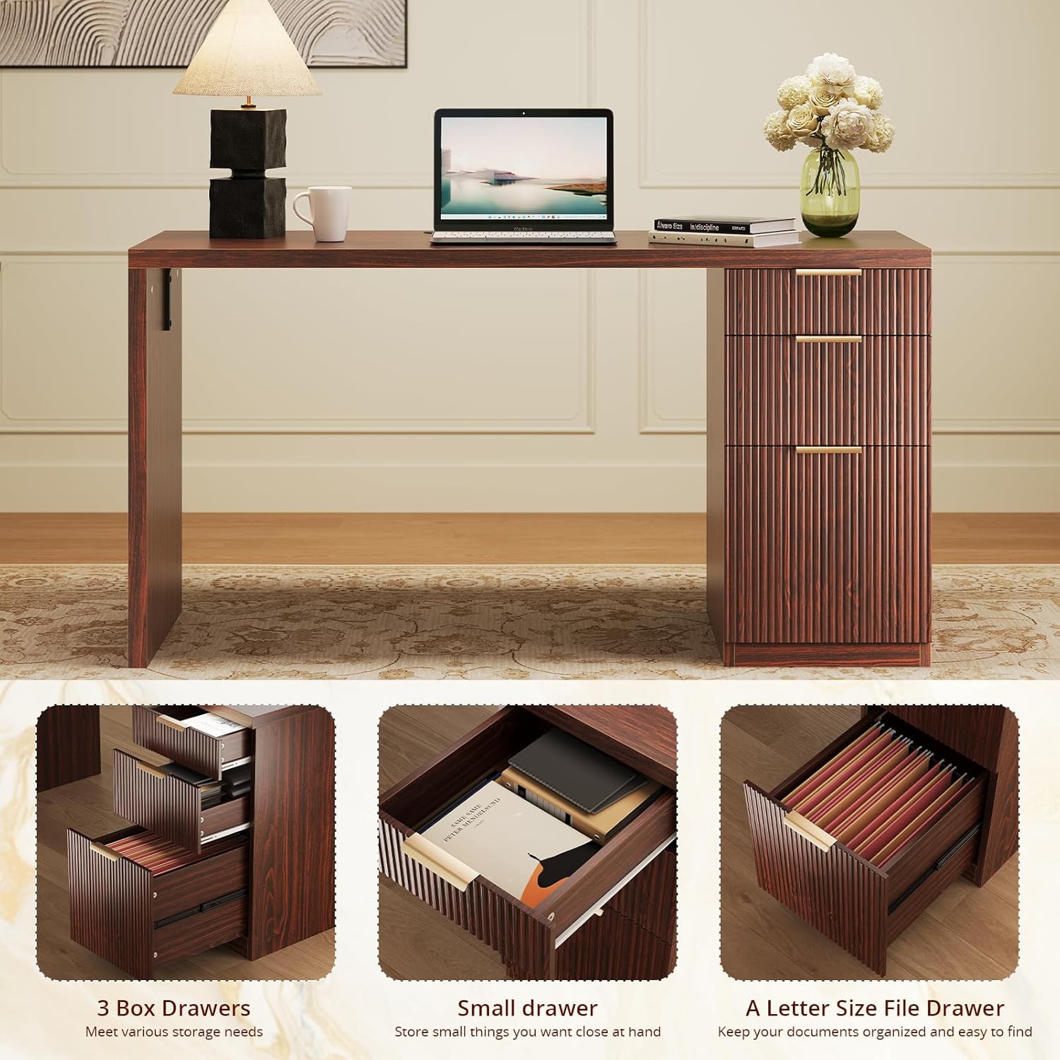 FURSUN 58" Modern Executive Desk with Storage, Home Office Desk with Drawer & Cabinet, Wooden Fluted Desk for Study, Living Room, Bedroom (Dark Walnut)