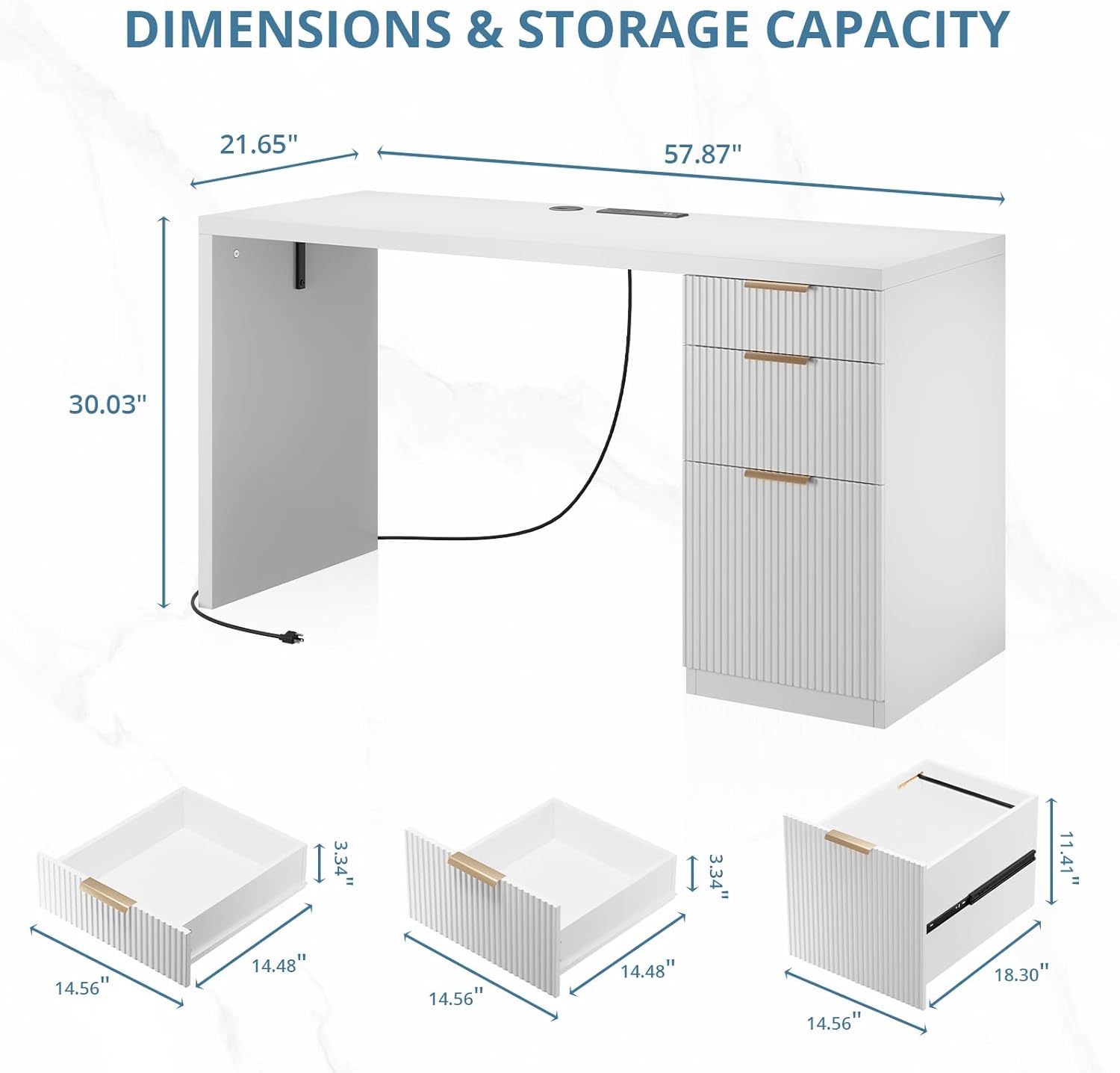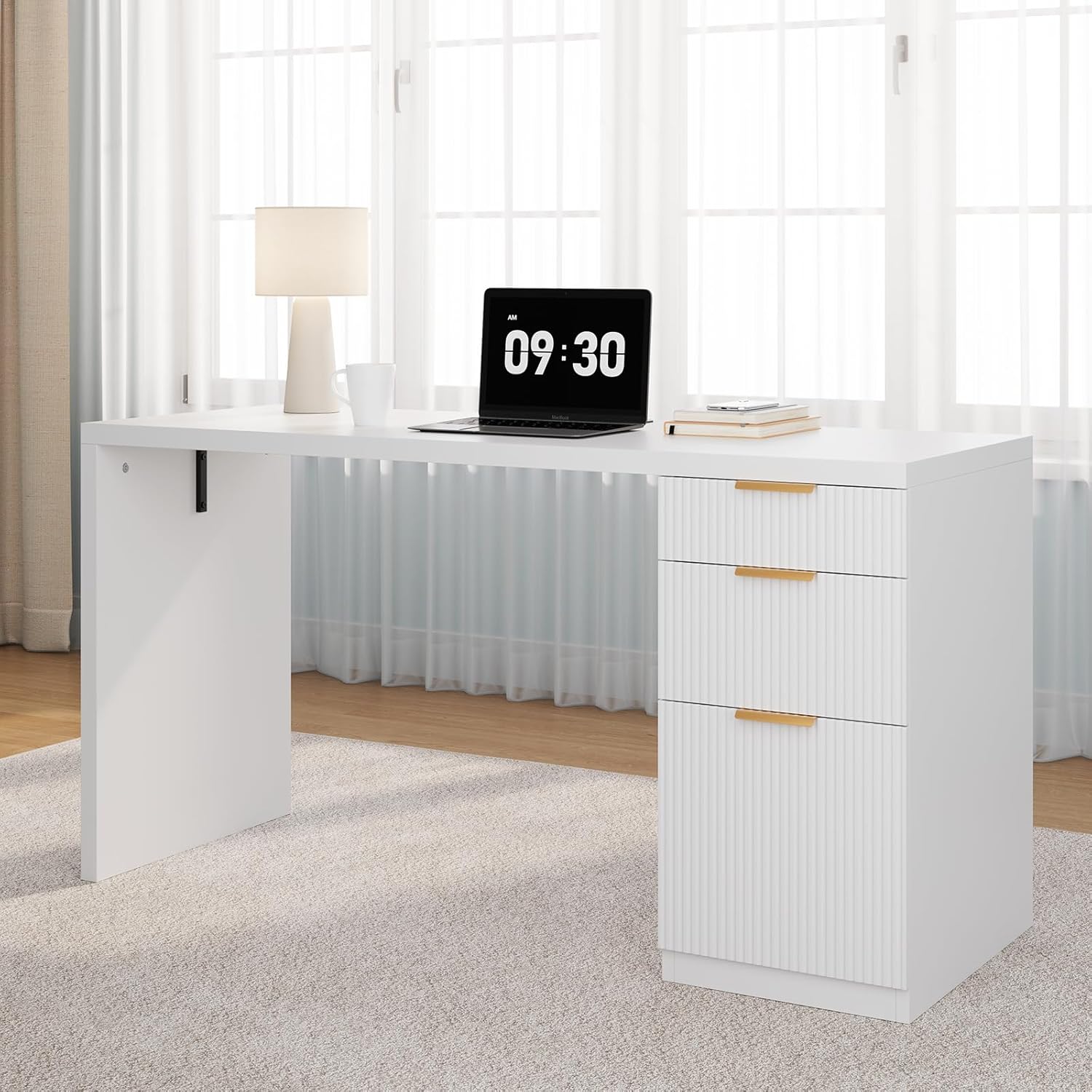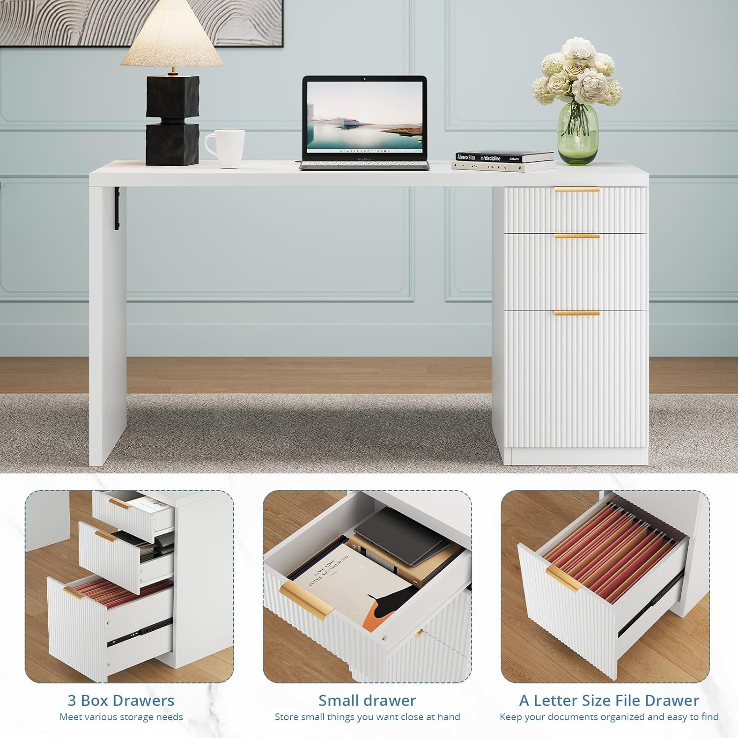 FURSUN 58" Modern Executive Desk with Storage, Home Office Desk with Drawer & Cabinet, Wooden Fluted Desk for Study, Living Room, Bedroom (White)