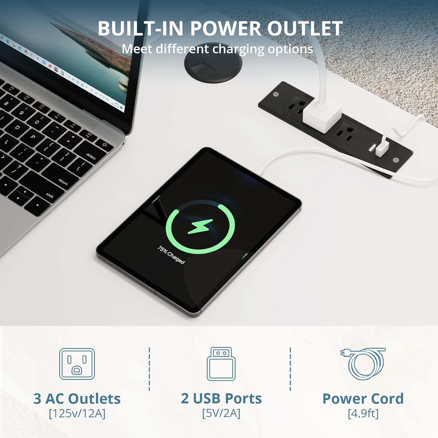 • This computer desk stays powered up with the built-in charging station, featuring 2 USB ports and 3 AC outlets—ideal for keeping your devices charged and cords neatly managed.