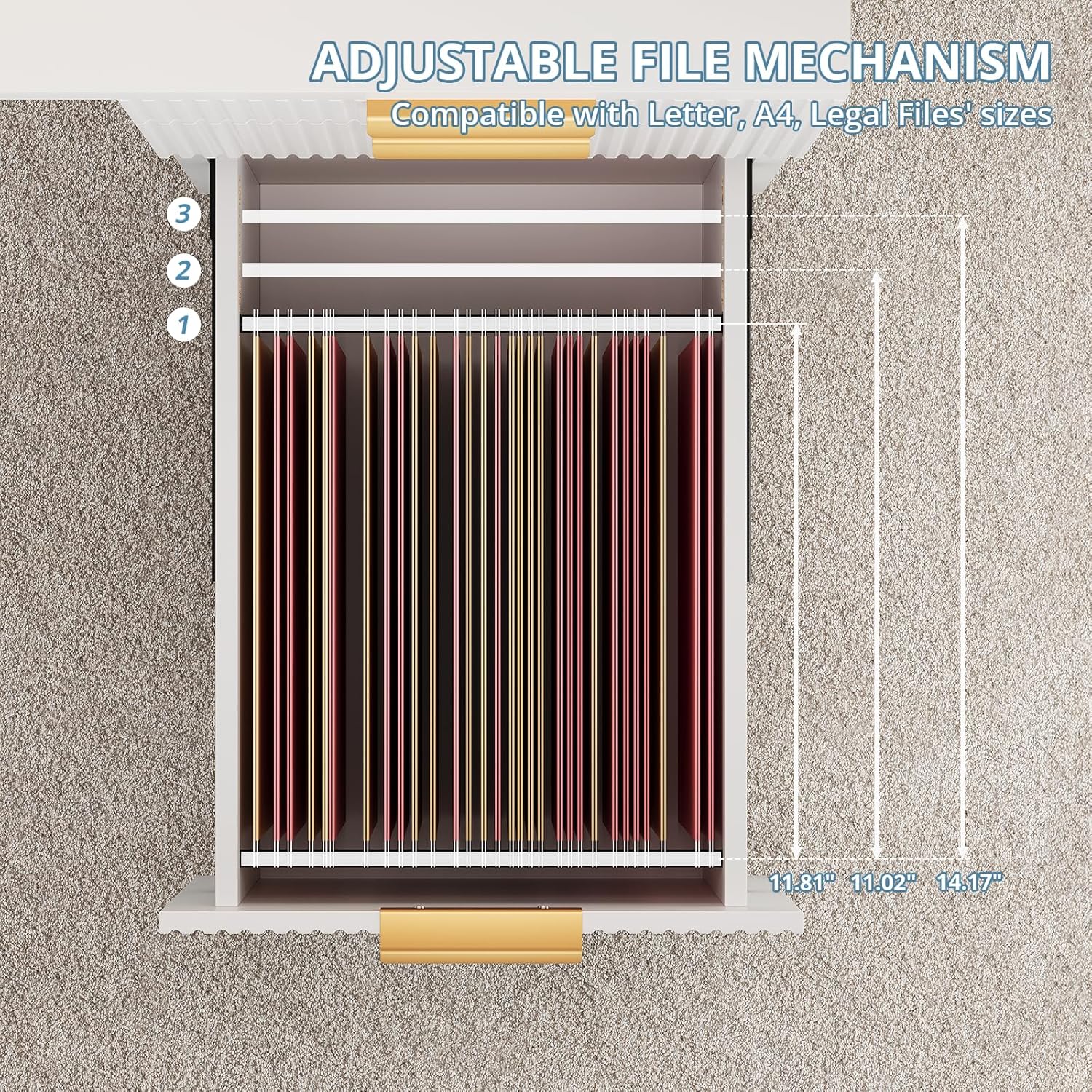 • The home office desk designed modular drawer system includes three different drawer sizes. The bottom file drawer comes with two adjustable metal hanging bars, allowing you to store Letter, Legal, and A4 folders with ease. These storage drawers are perfect for organizing office supplies, important documents, and daily essentials.