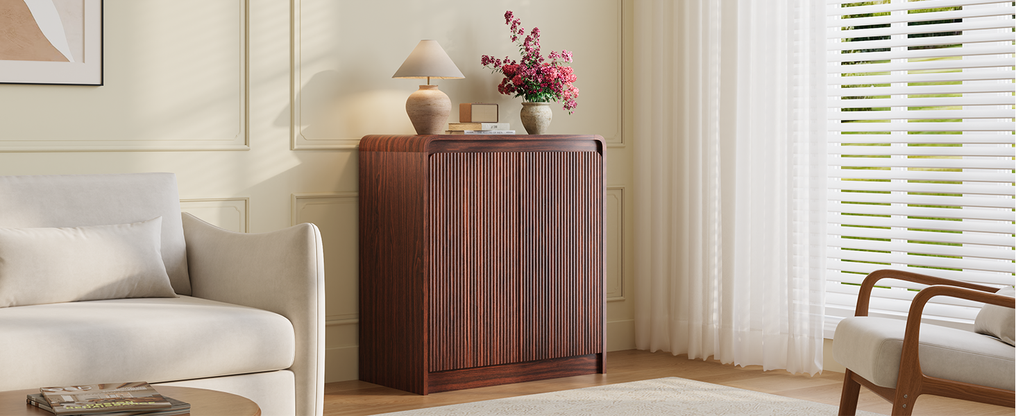 FURSUN Modern Fluted Sideboard Buffet Cabinet with Storage, Curved Design Wood Coffee Bar Cabinet with 2 Doors & Adjustable Shelves for Kitchen, Dining Room, Living Room, Dark Walnut