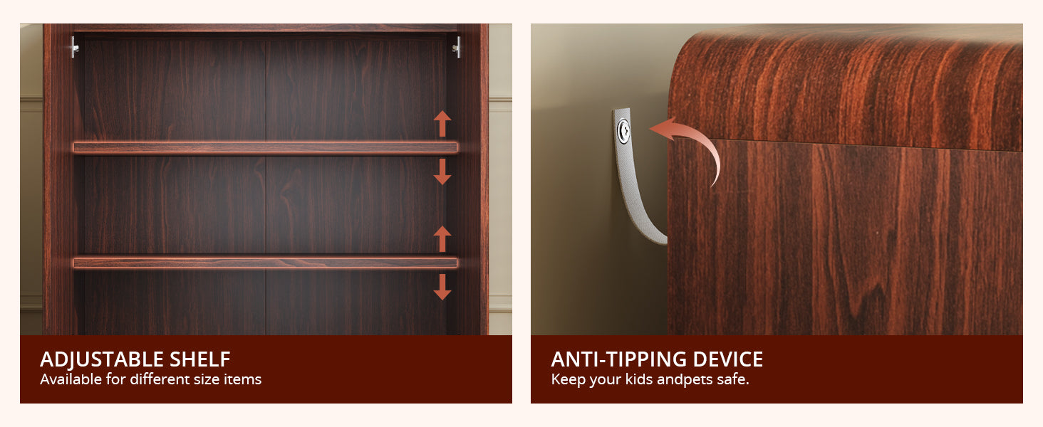 • Designed with two adjustable shelves that can be repositioned by 2.6 inches up or down, each shelf supports up to 22 lbs. Enjoy flexible storage space for a variety of items — this multifunctional buffet helps keep your home well-organized and clutter-free.